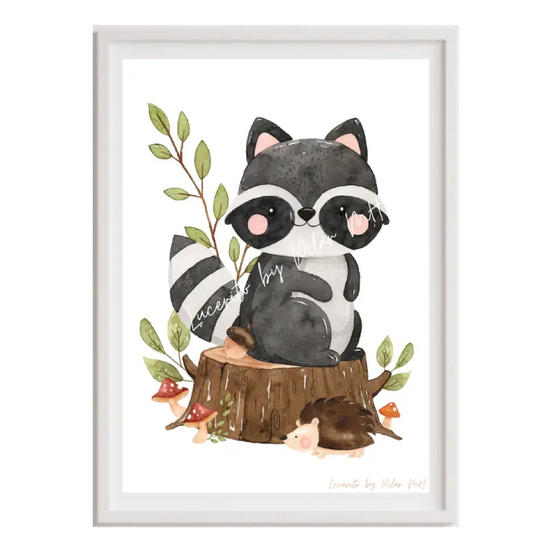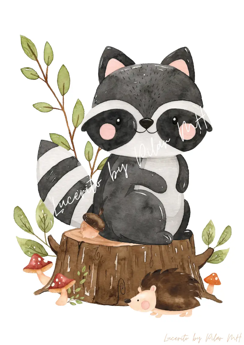 Una lámina infantil que representa un encantador escenario con un simpático mapache en un tronco y un erizo, alrededor del tronco, se encuentran hojas y hongos, capta la belleza de la naturaleza y despierta la curiosidad y la conexión de los niños con el mundo natural.