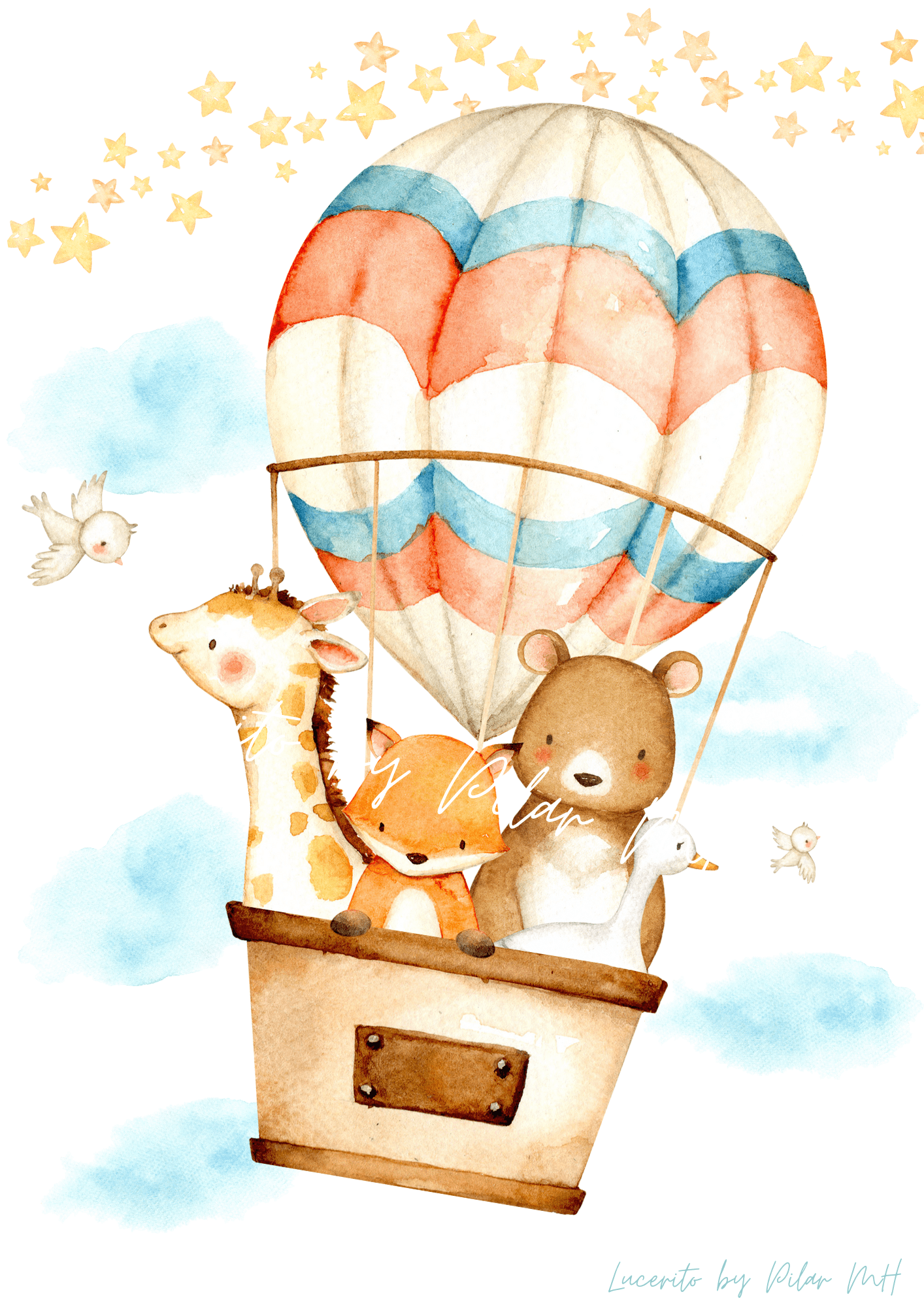 Dentro del alegre globo, un variado grupo de amigos animales comparte una emocionante aventura. Un simpático elefante asoma sus orejas grandes, un conejo simpático, un zorro con mirada curiosa y una jirafa con su cuello largo y elegante, que se asoma con gracia desde el interior del globo.