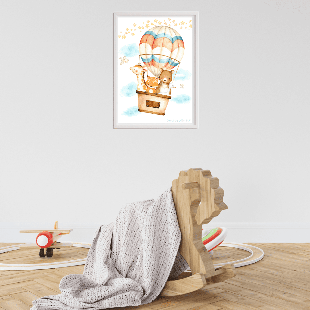 Encantadora lámina infantil donde la protagonista es un globo aerostático de color naranja que se eleva en el cielo. El fondo está adornado con un tapiz de estrellas.