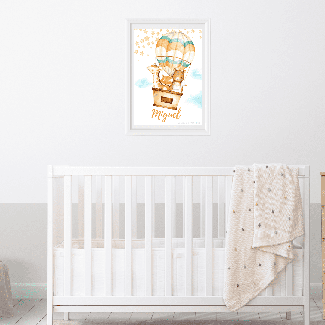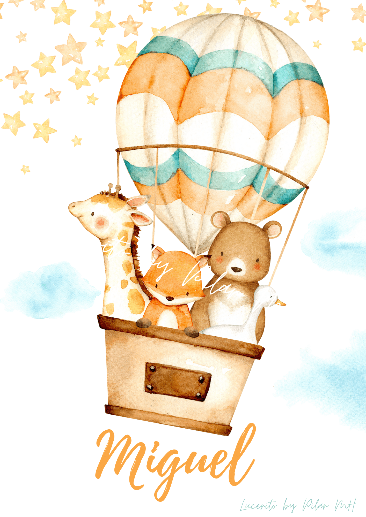 Encantadora lámina infantil donde la protagonista es un globo aerostático de color naranja que se eleva en el cielo y personalizado con el nombre del niño o la niña.. El fondo está adornado con un tapiz de estrellas.